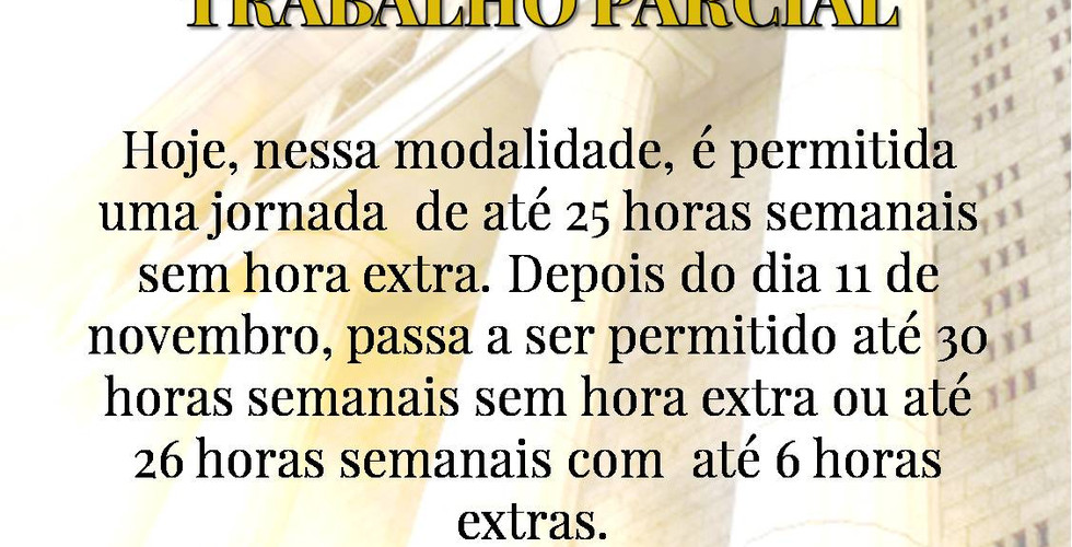 Trabalho parcial - Hoje, nessa modalidade, é permitida uma jornada de até 25 horas semanais sem hora extra. Depois do dia 11 de novembro, passa a ser permitido até 30 horas semanais sem hora extra ou até 26 horas semanais com até 6 horas extras.